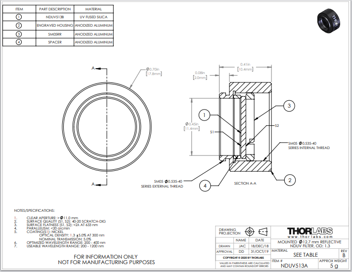Thorlabs索雷博 NDUV513A 反射型中性密度滤光片