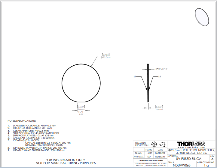 Thorlabs索雷博       NDUVW06B   楔形反射型UVFS ND滤光片
