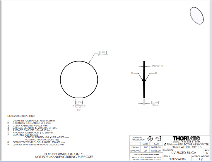 Thorlabs索雷博 NDUVW08B 楔形反射型UVFS ND滤光片