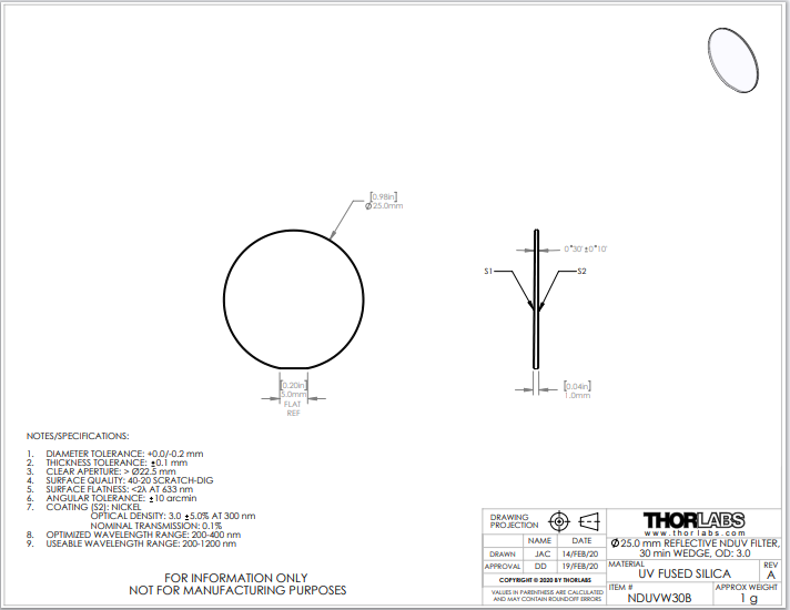 Thorlabs索雷博 NDUVW30B 楔形反射型UVFS ND滤光片