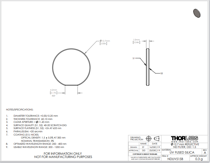 Thorlabs索雷博 NDUV515B 中性密度滤光片