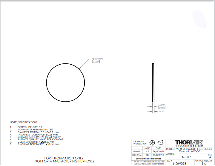 Thorlabs索雷博 NDW09B 楔形反射型Ø25 mm ND滤光片