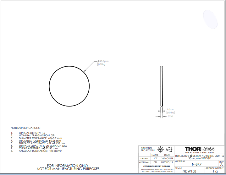 Thorlabs索雷博 NDW15B 楔形反射型Ø25 mm ND滤光片