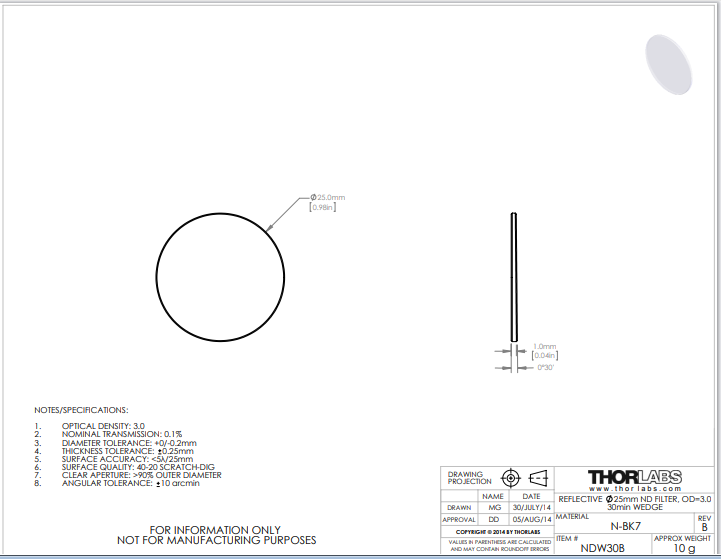 Thorlabs索雷博 NDW30B 楔形反射型Ø25 mm ND滤光片