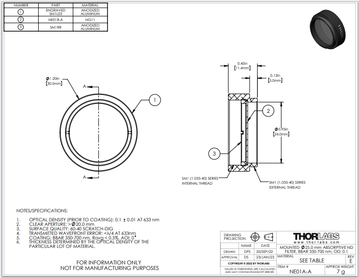 Thorlabs索雷博 NE01A-A Ø25 mm镀增透膜的吸收型中性密度滤光片