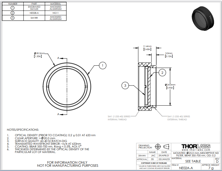Thorlabs索雷博 NE02A-A Ø25 mm镀增透膜的吸收型中性密度滤光片