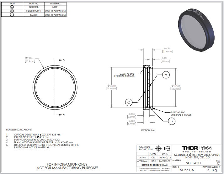 Thorlabs索雷博 NE2R03A 吸收型中性密度滤光片