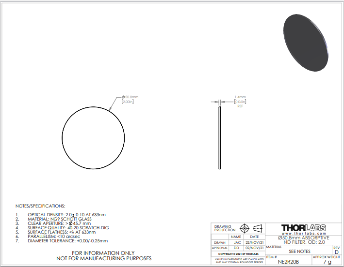Thorlabs索雷博 NE2R20B 吸收型中性密度滤光片