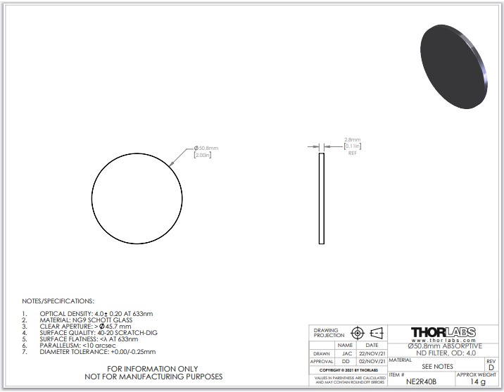 Thorlabs索雷博 NE2R40B 吸收型中性密度滤光片