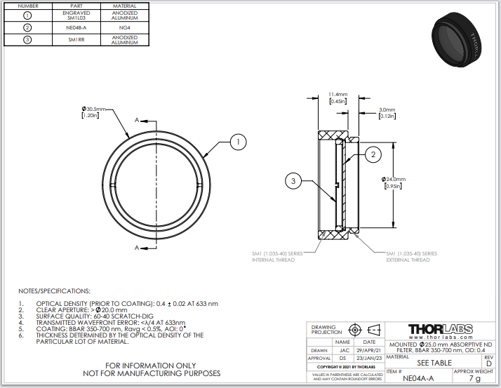 Thorlabs索雷博       NE04A-A   Ø25 mm镀增透膜的吸收型中性密度滤光片