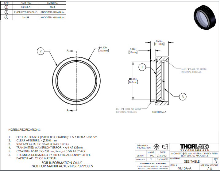Thorlabs索雷博 NE15A-A Ø25 mm镀增透膜的吸收型中性密度滤光片