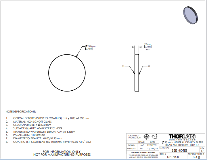 Thorlabs索雷博 NE15B-B 中性密度滤光片