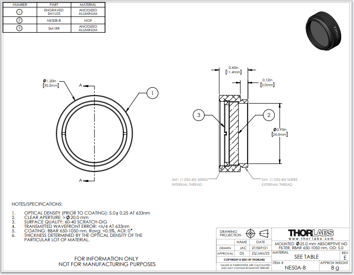 Thorlabs索雷博       NE50A-B   吸收型中性密度滤光片