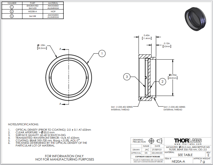 Thorlabs索雷博 NE20A-A Ø25 mm镀增透膜的吸收型中性密度滤光片