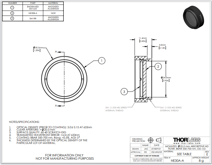 Thorlabs索雷博       NE30A-A   Ø25 mm镀增透膜的吸收型中性密度滤光片