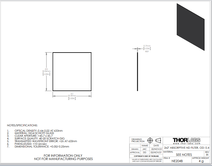 Thorlabs索雷博       NE204B   吸收型中性密度滤光片