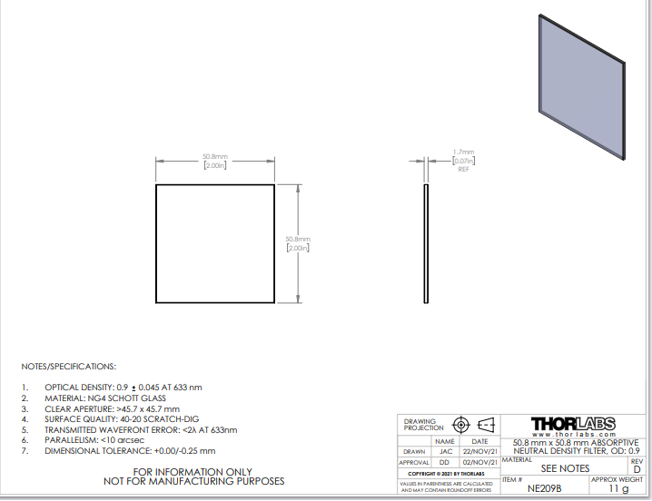 Thorlabs索雷博       NE209B   吸收型中性密度滤光片