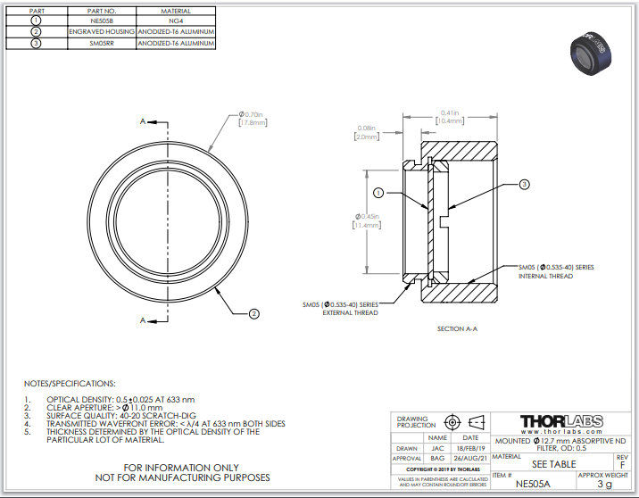 Thorlabs索雷博       NE505A   吸收型中性密度滤光片