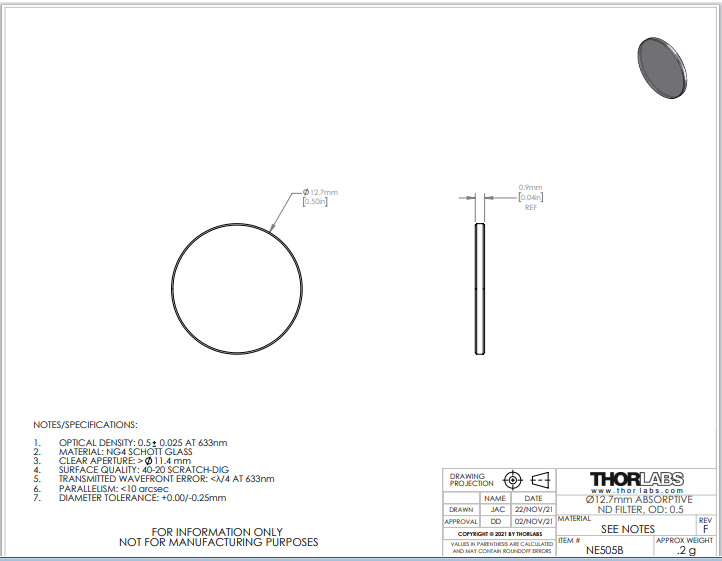 Thorlabs索雷博       NE505B   吸收型中性密度滤光片
