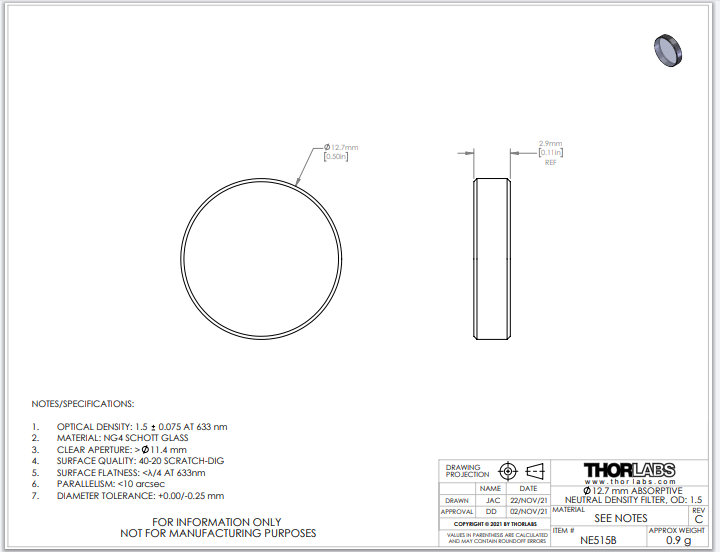 Thorlabs索雷博 NE515B 吸收型中性密度滤光片