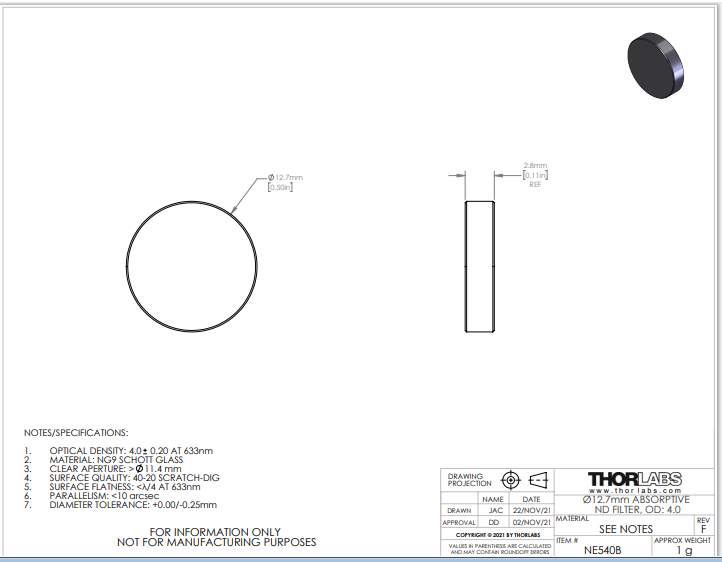 Thorlabs索雷博 NE540B 吸收型中性密度滤光片