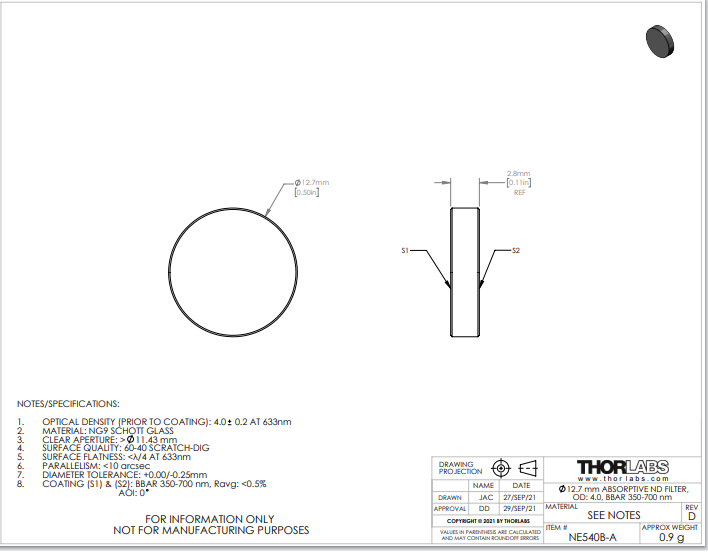 Thorlabs索雷博 NE540B-A 中性密度滤光片