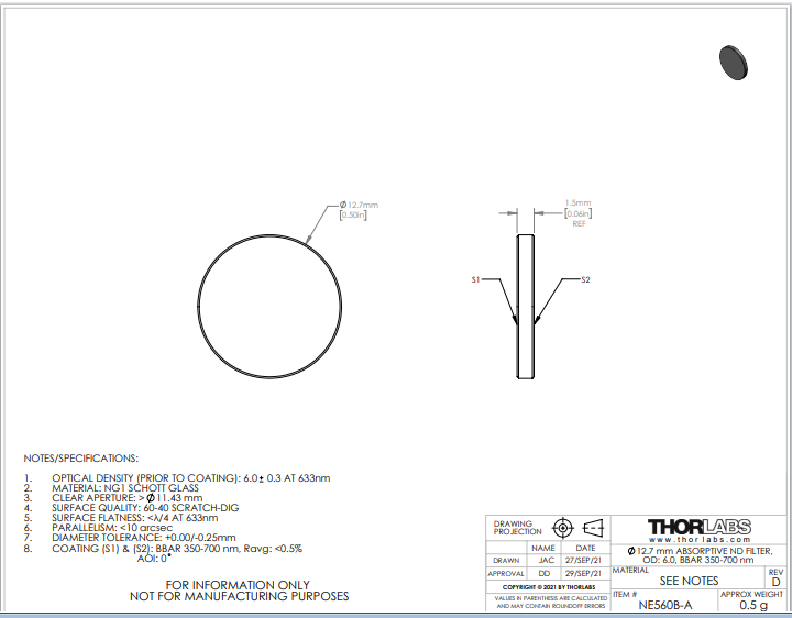 Thorlabs索雷博 NE560B-A 中性密度滤光片