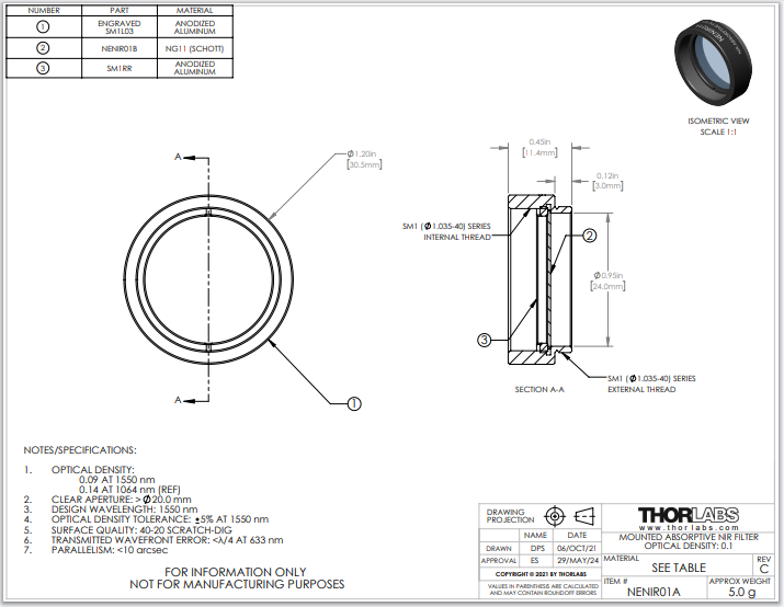 Thorlabs索雷博 NENIR01A Ø25 mm NIR吸收型中性密度滤光片
