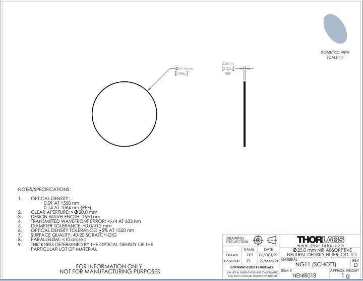 Thorlabs索雷博 NENIR01B NIR中性密度滤光片