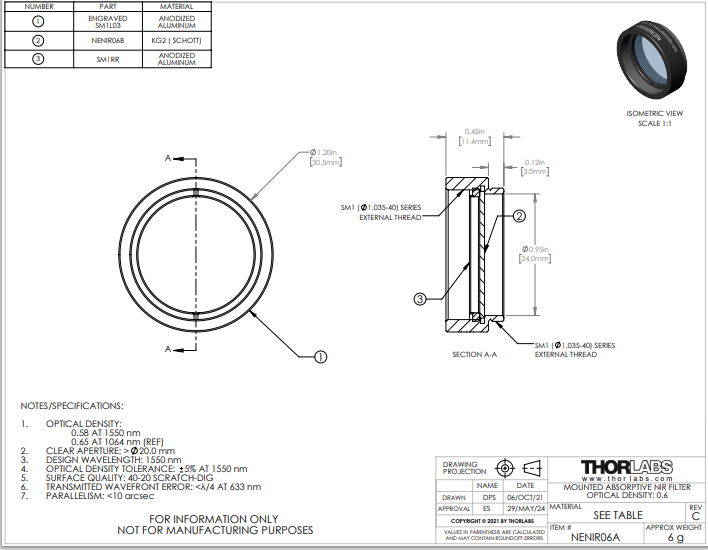 Thorlabs索雷博 NENIR06A Ø25 mm NIR吸收型中性密度滤光片