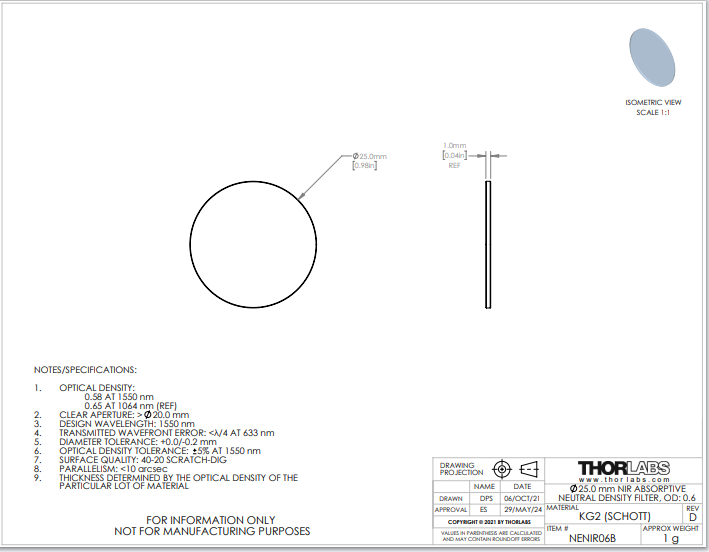 Thorlabs索雷博 NENIR06B NIR中性密度滤光片