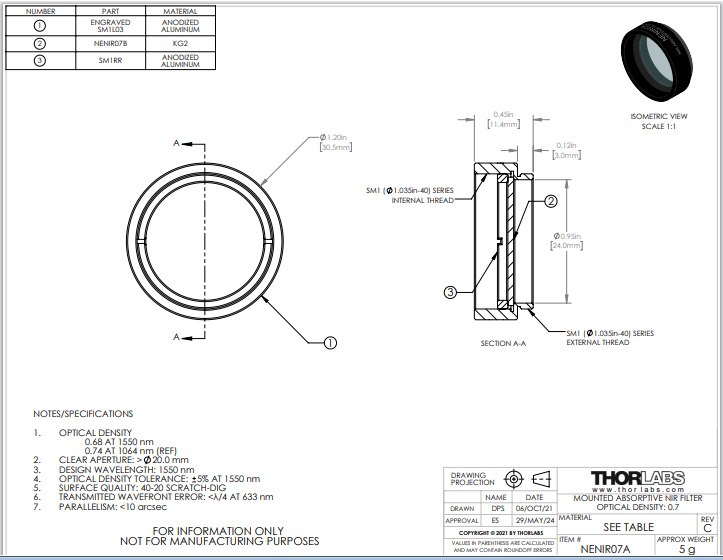 Thorlabs索雷博 NENIR07A Ø25 mm NIR吸收型中性密度滤光片
