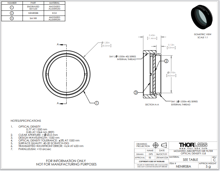 Thorlabs索雷博 NENIR08A Ø25 mm NIR吸收型中性密度滤光片