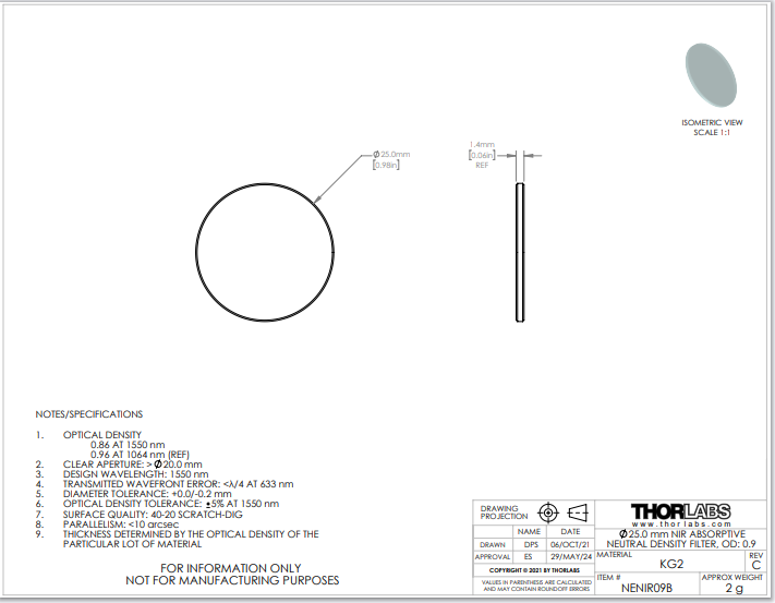 Thorlabs索雷博 NENIR09B NIR中性密度滤光片