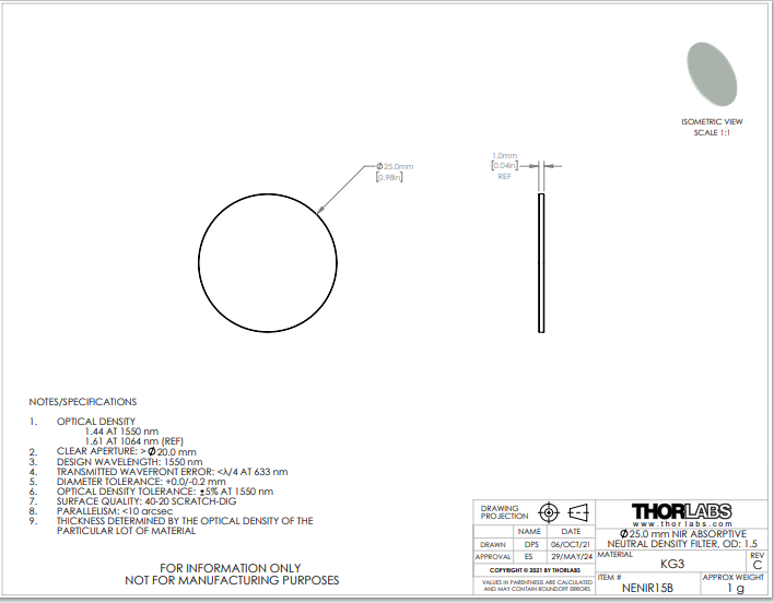 Thorlabs索雷博 NENIR15B NIR中性密度滤光片