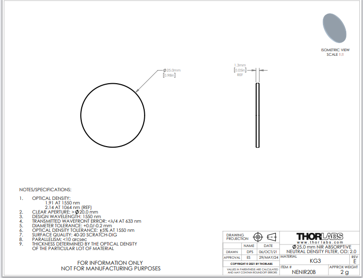 Thorlabs索雷博 NENIR20B NIR中性密度滤光片