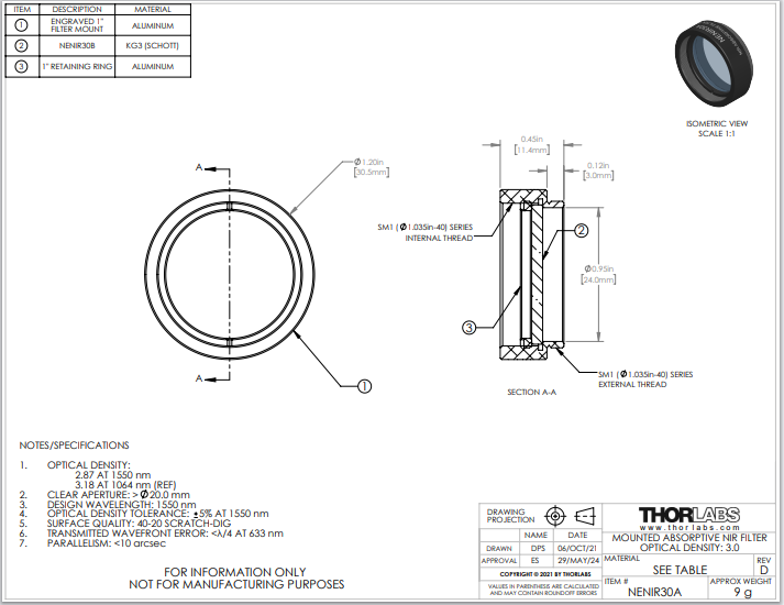 Thorlabs索雷博 NENIR30A Ø25 mm NIR吸收型中性密度滤光片