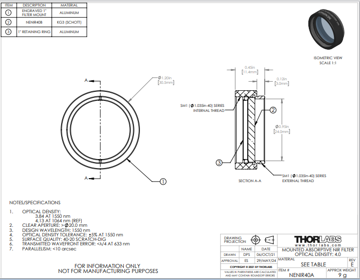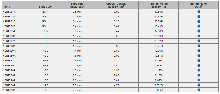 Thorlabs索雷博 NENIR40A Ø25 mm NIR吸收型中性密度滤光片