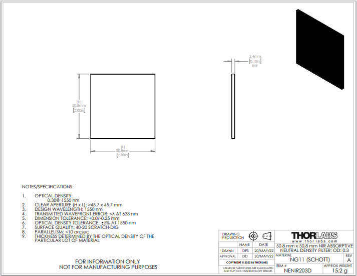 Thorlabs索雷博 NENIR203D NIR中性密度滤光片