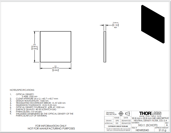 Thorlabs索雷博 NENIR204D NIR中性密度滤光片