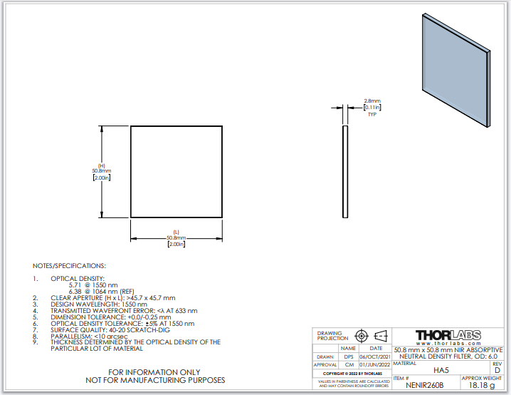 Thorlabs索雷博 NENIR260B NIR中性密度滤光片