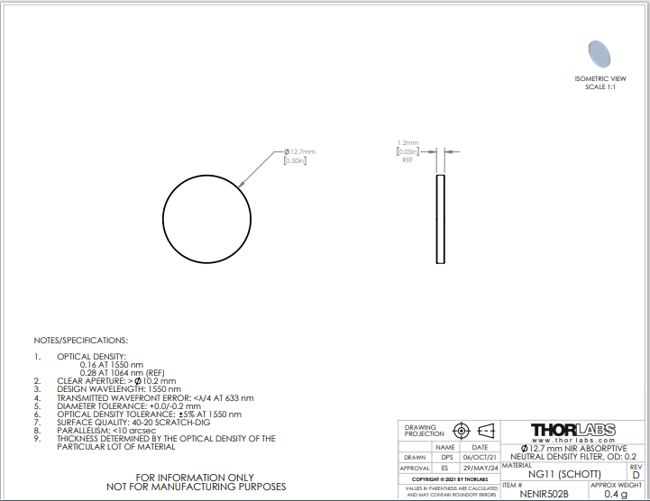 Thorlabs索雷博 NENIR502B NIR中性密度滤光片