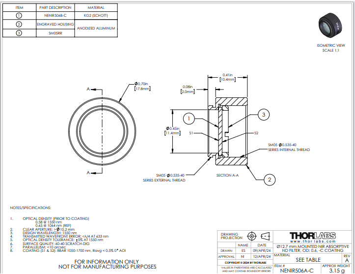 Thorlabs索雷博 NENIR506A-C 中性密度滤光片