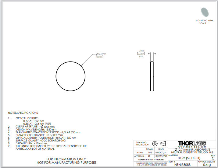 Thorlabs索雷博 NENIR508B NIR中性密度滤光片