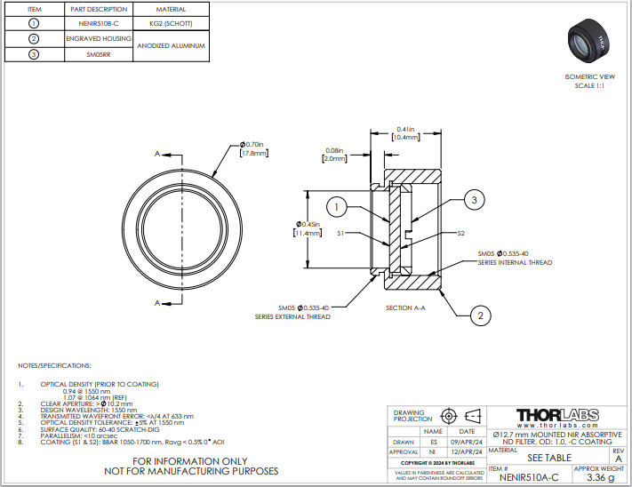 Thorlabs索雷博 NENIR510A-C 中性密度滤光片