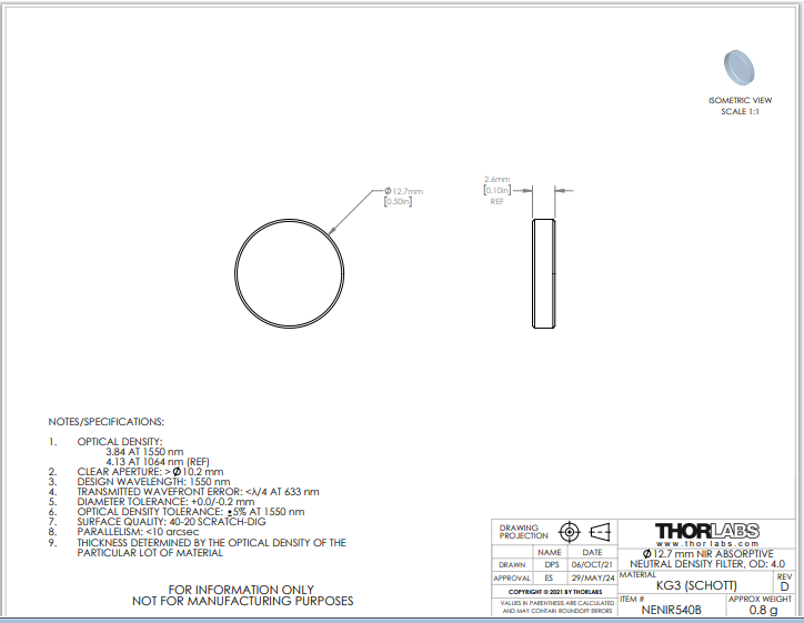 Thorlabs索雷博       NENIR540B   NIR中性密度滤光片