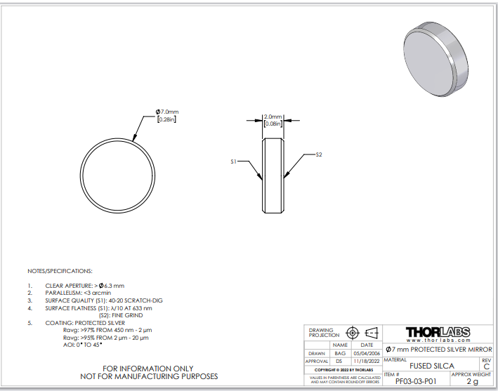 Thorlabs索雷博 PF03-03-P01 平面反射镜