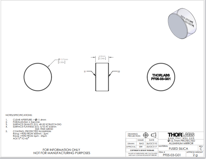 Thorlabs索雷博 PF05-03-G01-10 平面反射镜