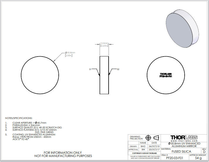 Thorlabs索雷博 PF20-03-F01 平面反射镜