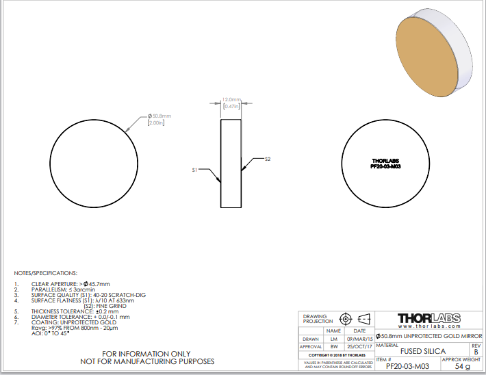 Thorlabs索雷博       PF20-03-M03-10   圆形平面反射镜
